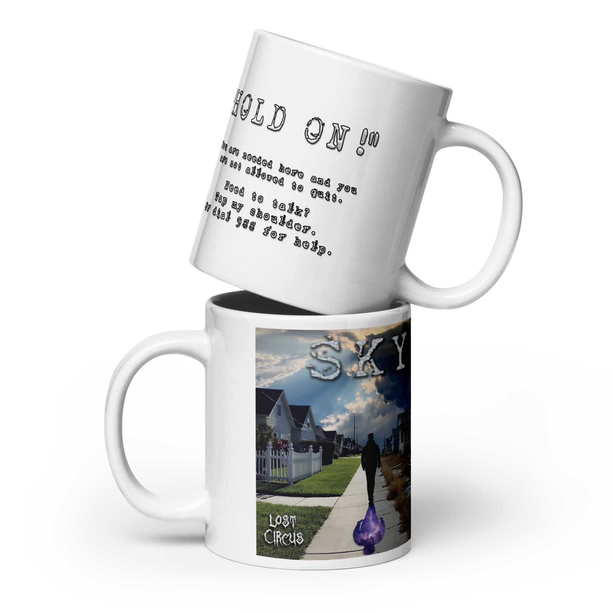 Sky - "HOLD ON!" White Mug (Suicide Prevention and Awareness Month)